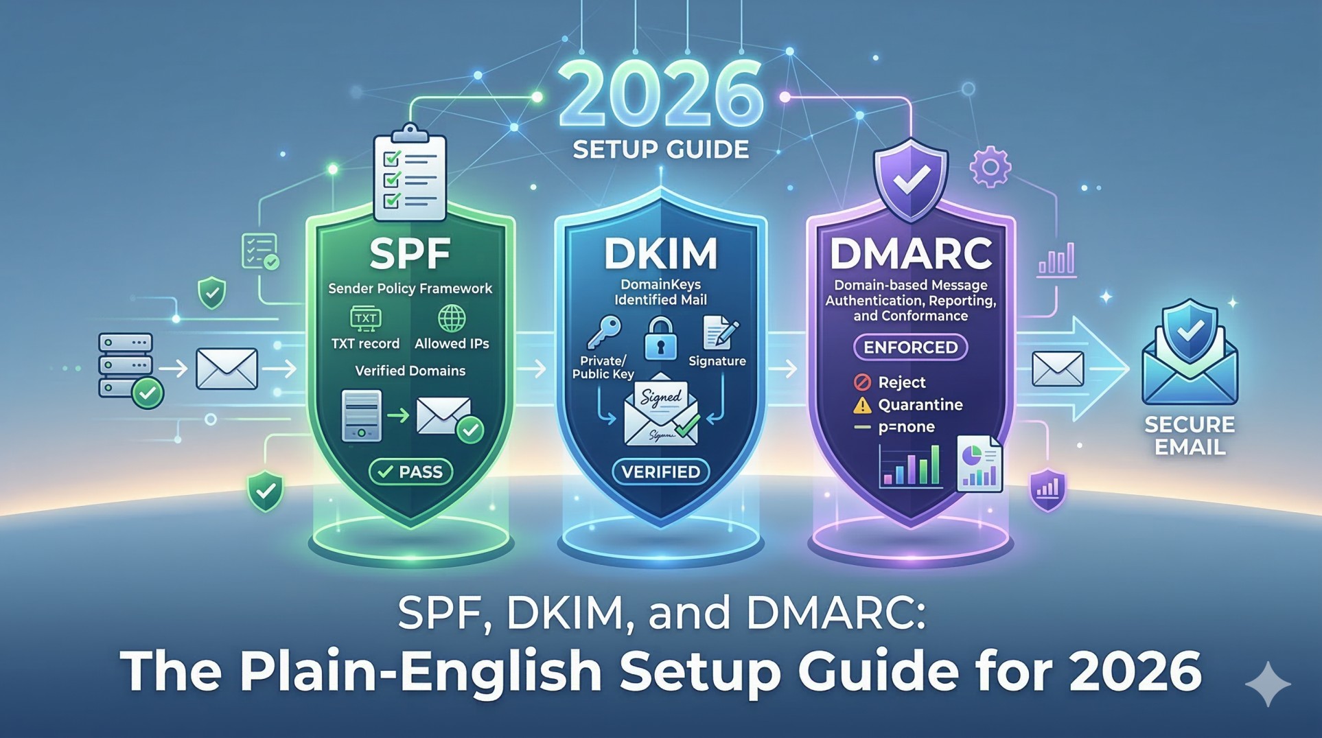 This guide closes that gap. You will get plain-English explanations of what SPF, DKIM, and DMARC actually do, why each one matters, copy-paste DNS records for immediate implementation, step-by-step setup for all major email platforms and DNS providers, the exact DMARC rollout roadmap, every common mistake and its fix, and a complete troubleshooting guide.